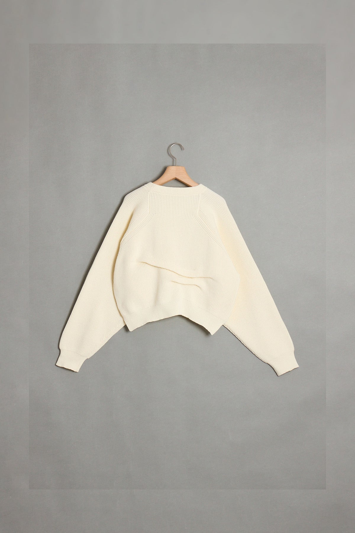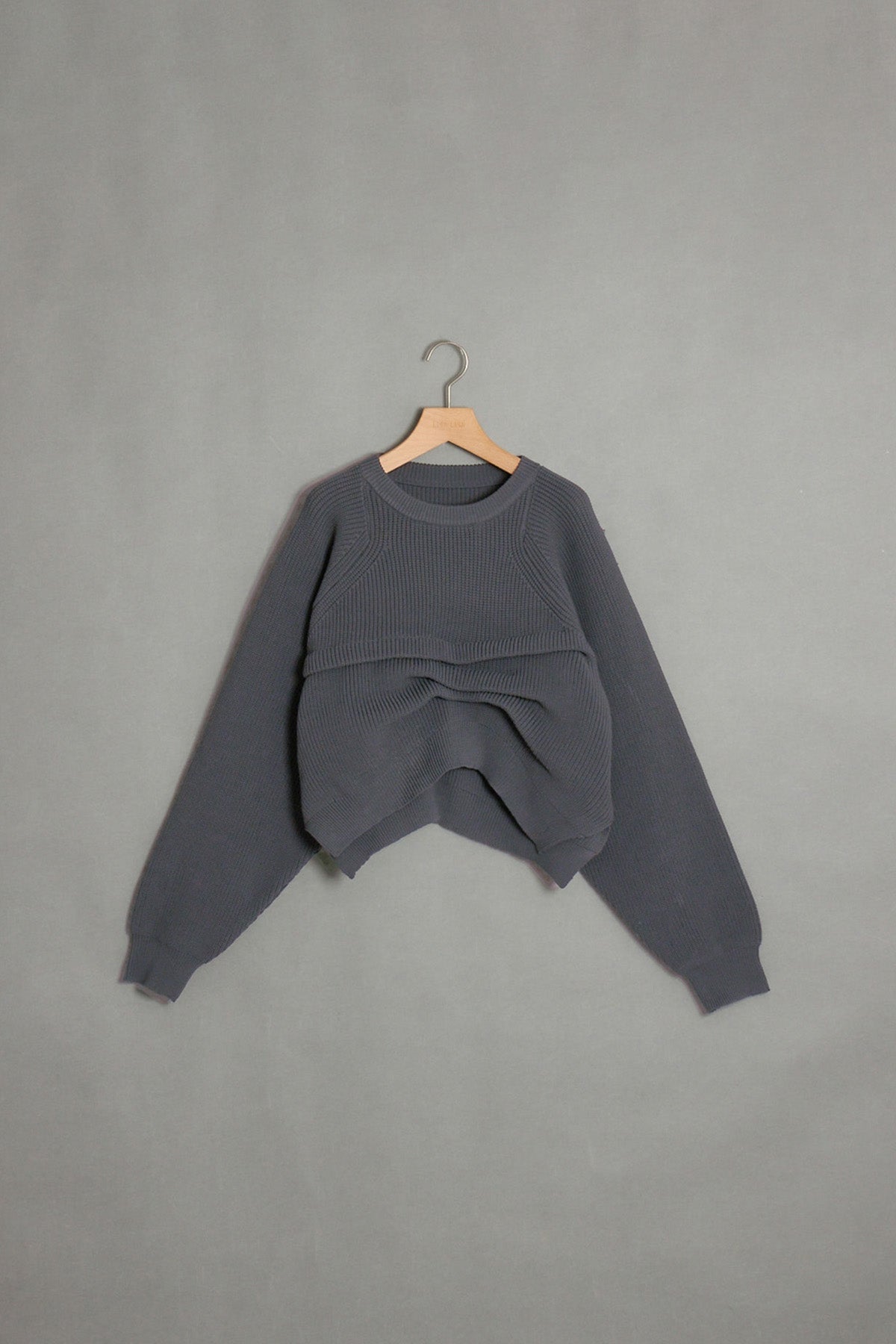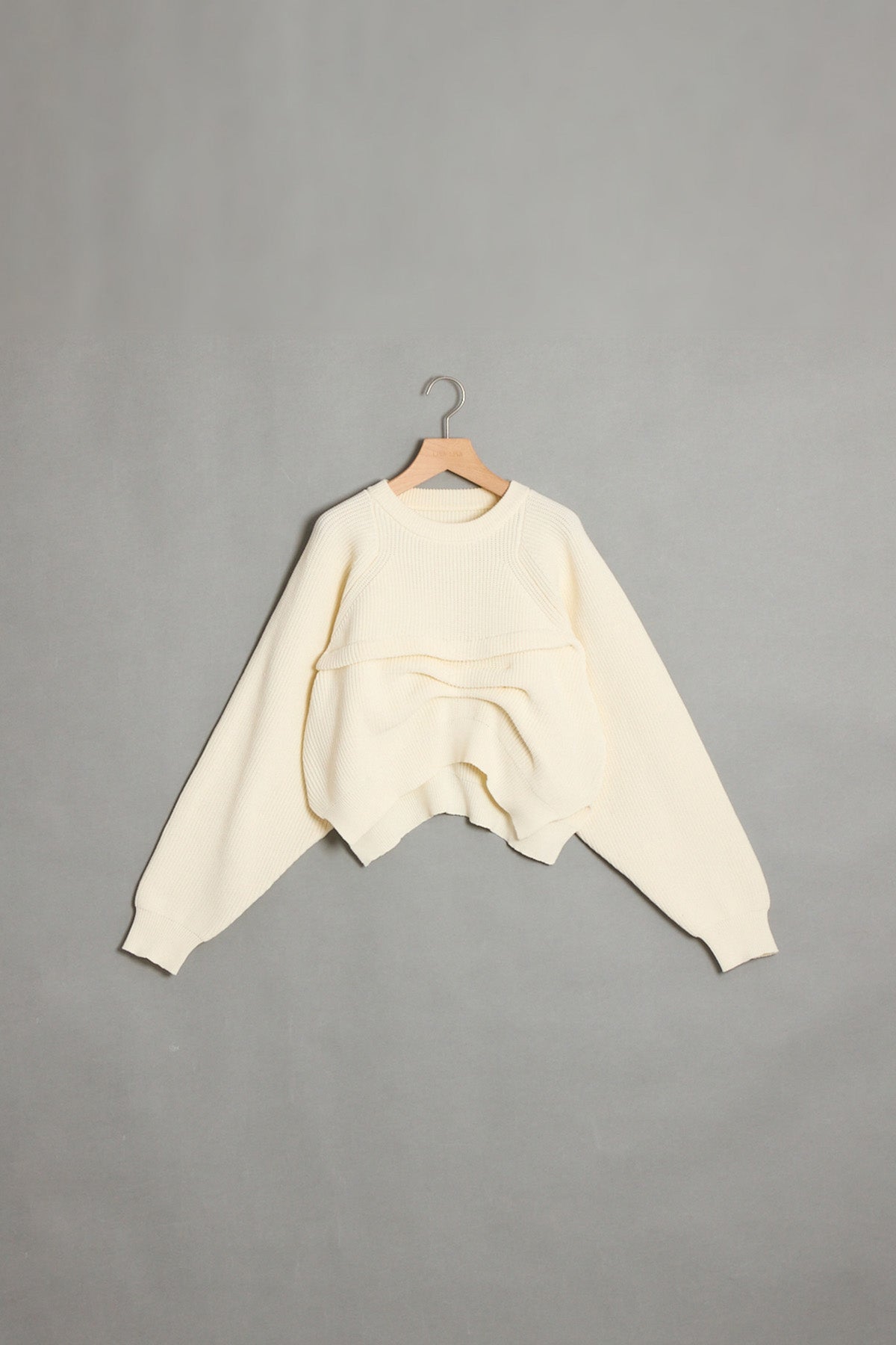 立体感のある編み地と前後にアシンメトリーのタックデザインが、シンプルな中にエッジを効かせたニット