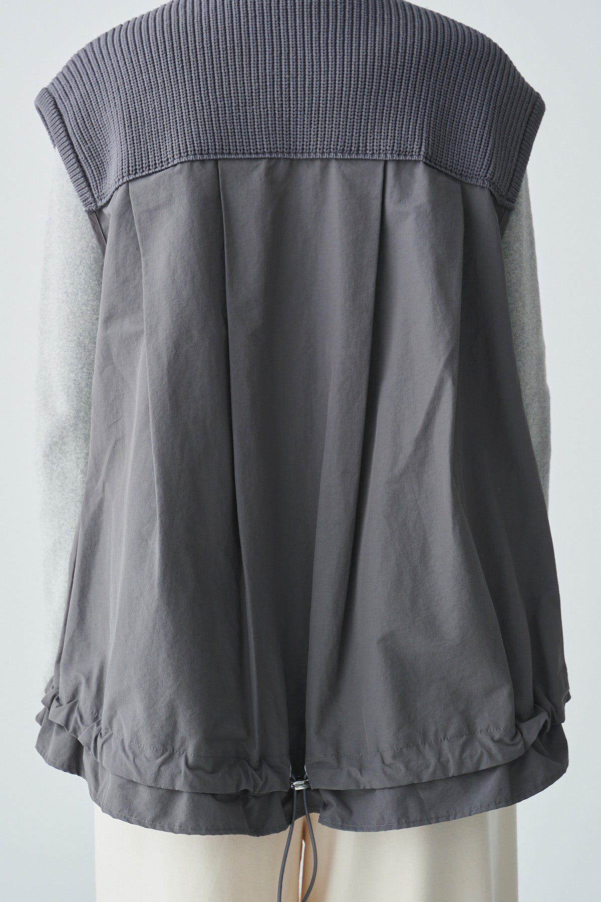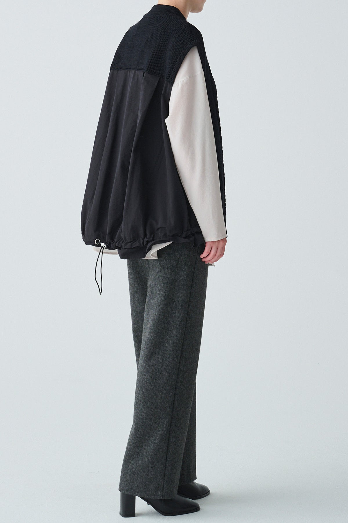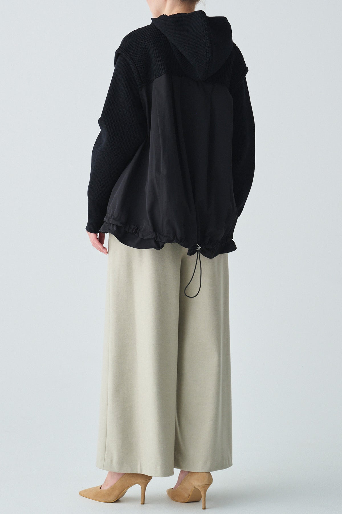 異素材の切替えで奥行きのある表情を生み出し、後ろ姿にも軽やかな動きをプラス