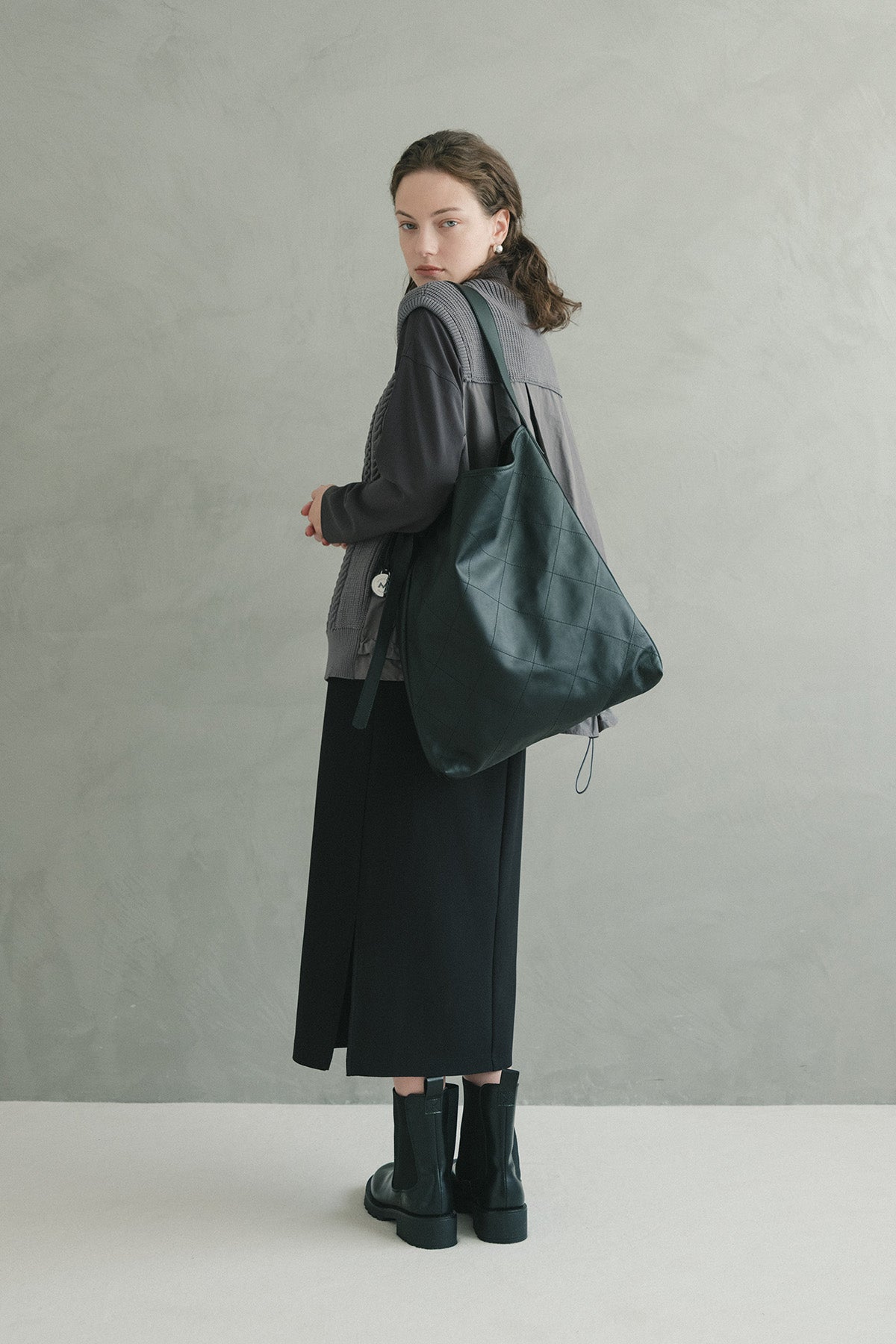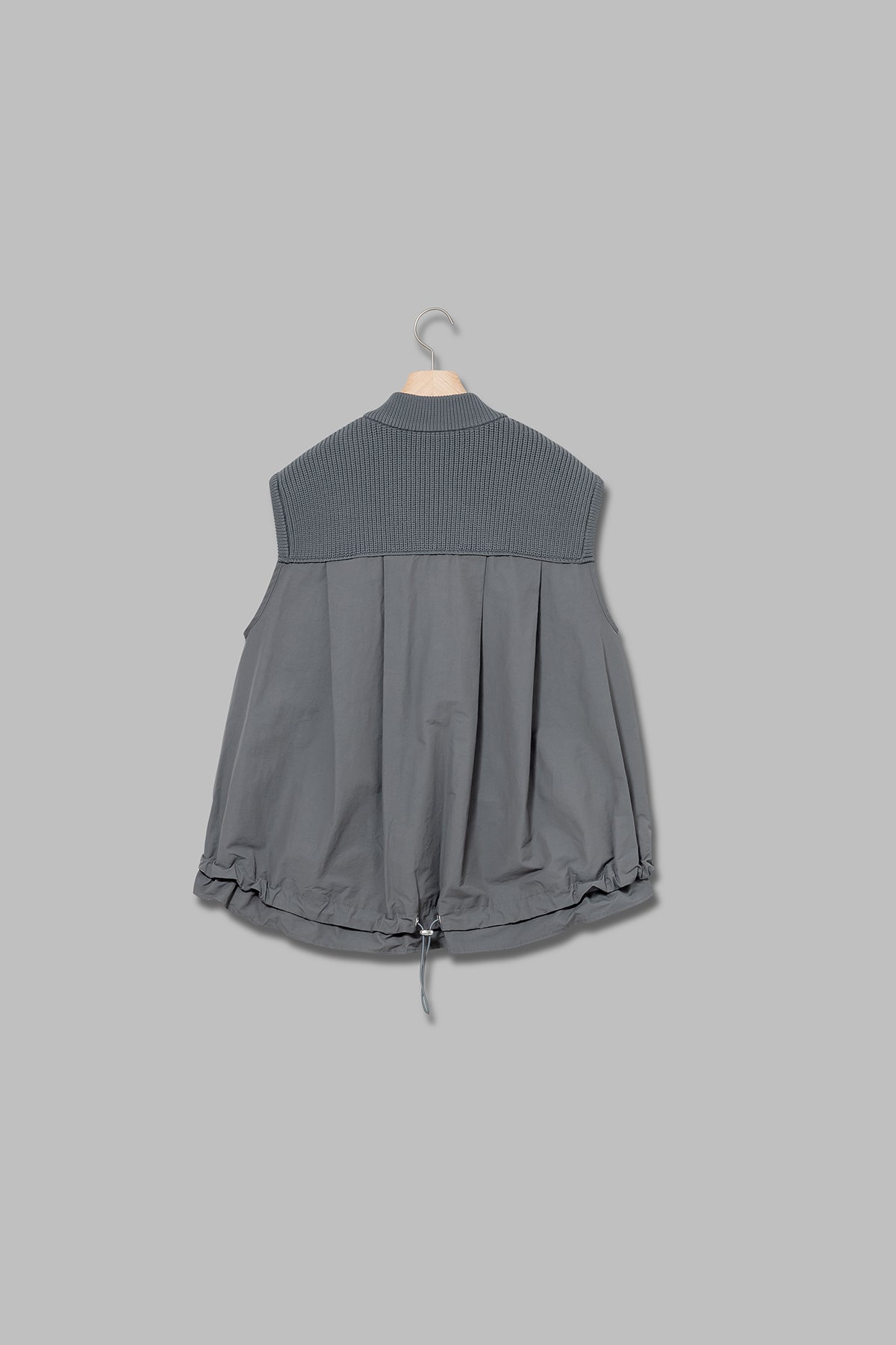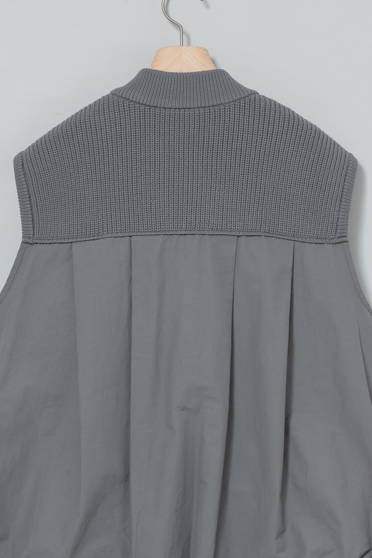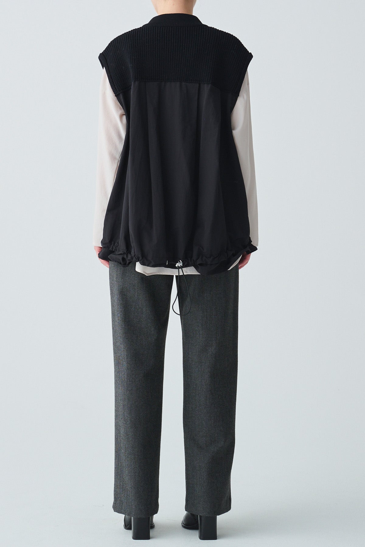異素材の切替えで奥行きのある表情を生み出し、後ろ姿にも軽やかな動きをプラス