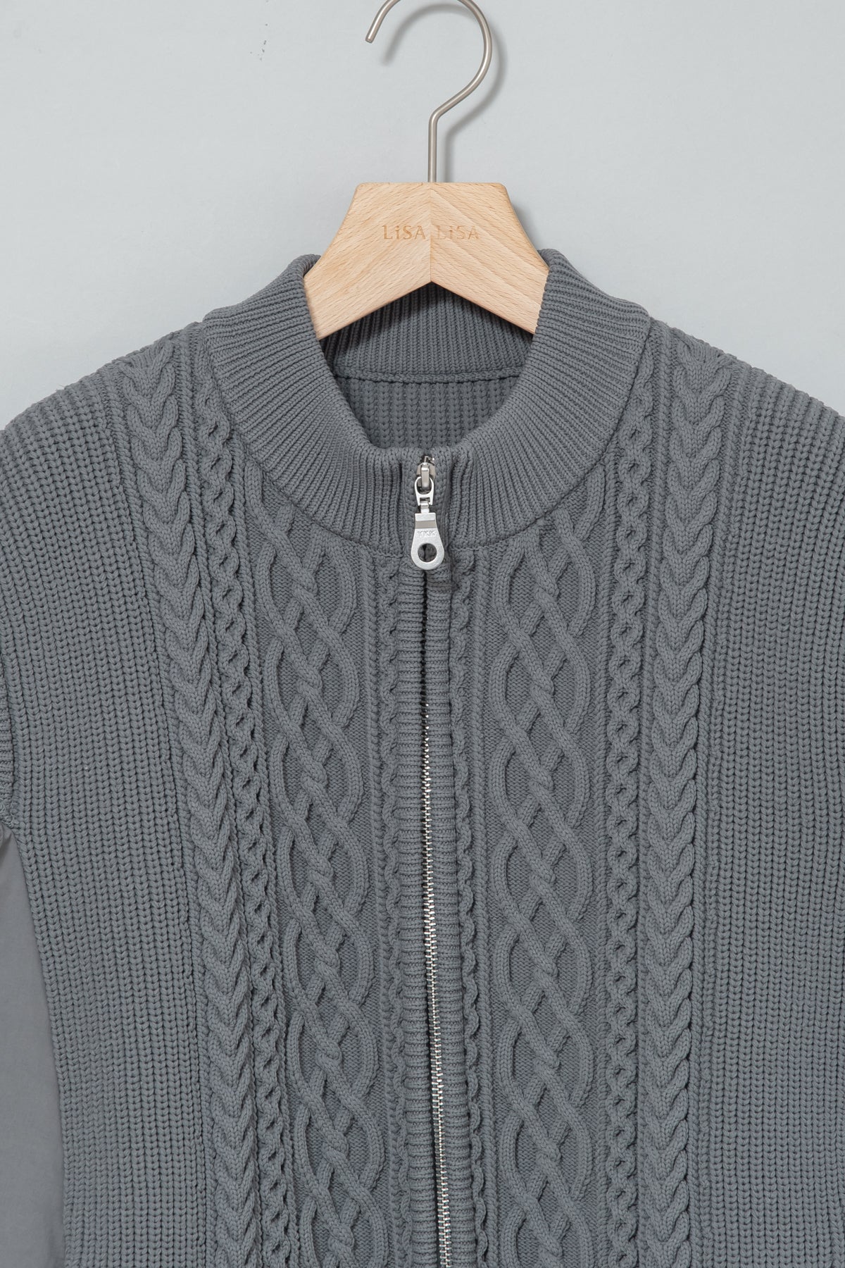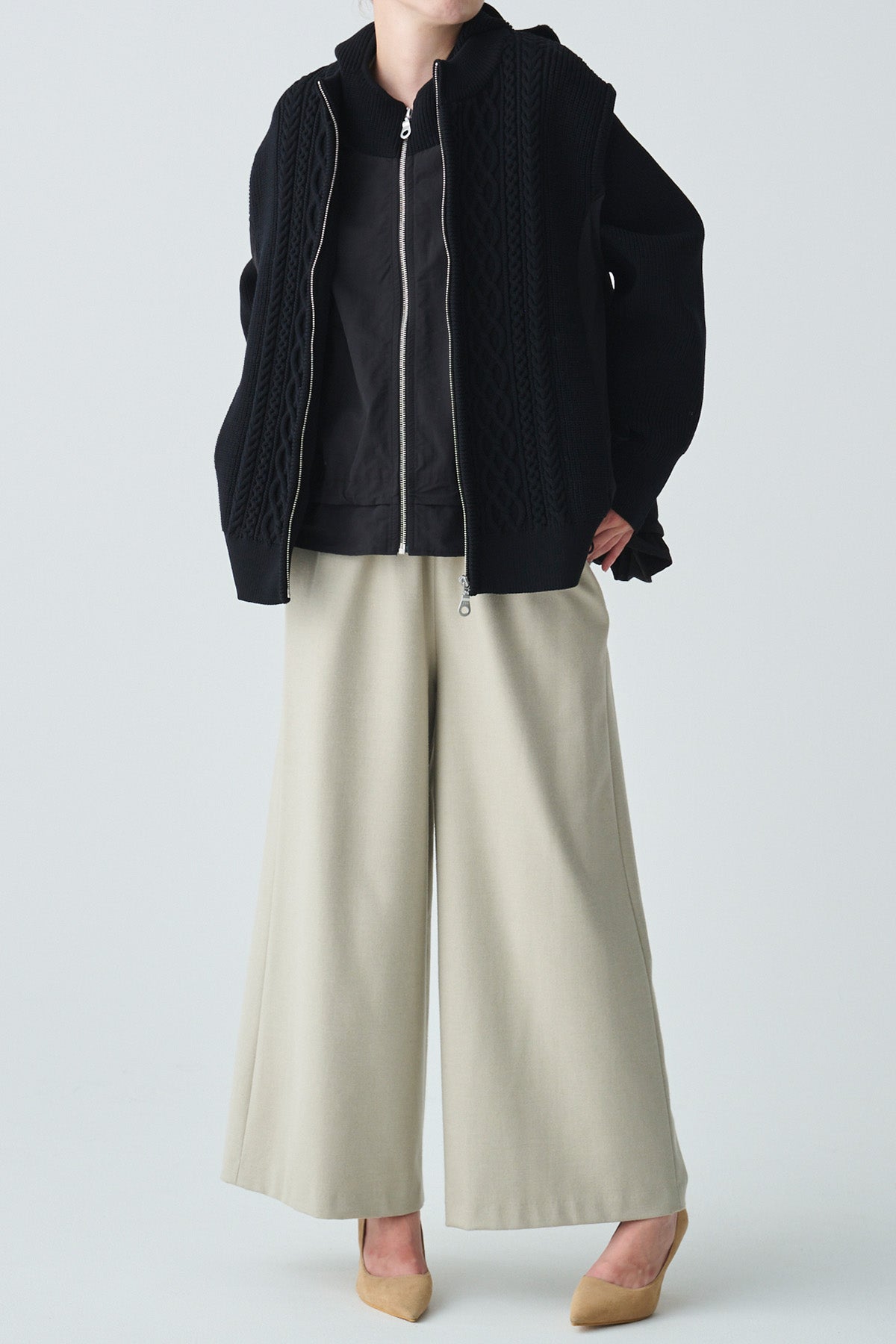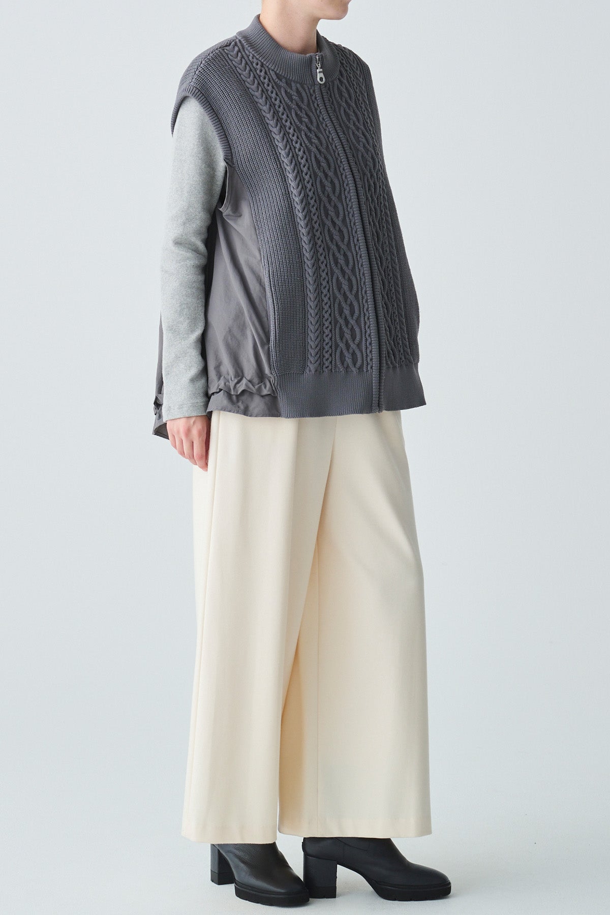 フロントに施された立体感のあるケーブル編みが目を惹くベスト