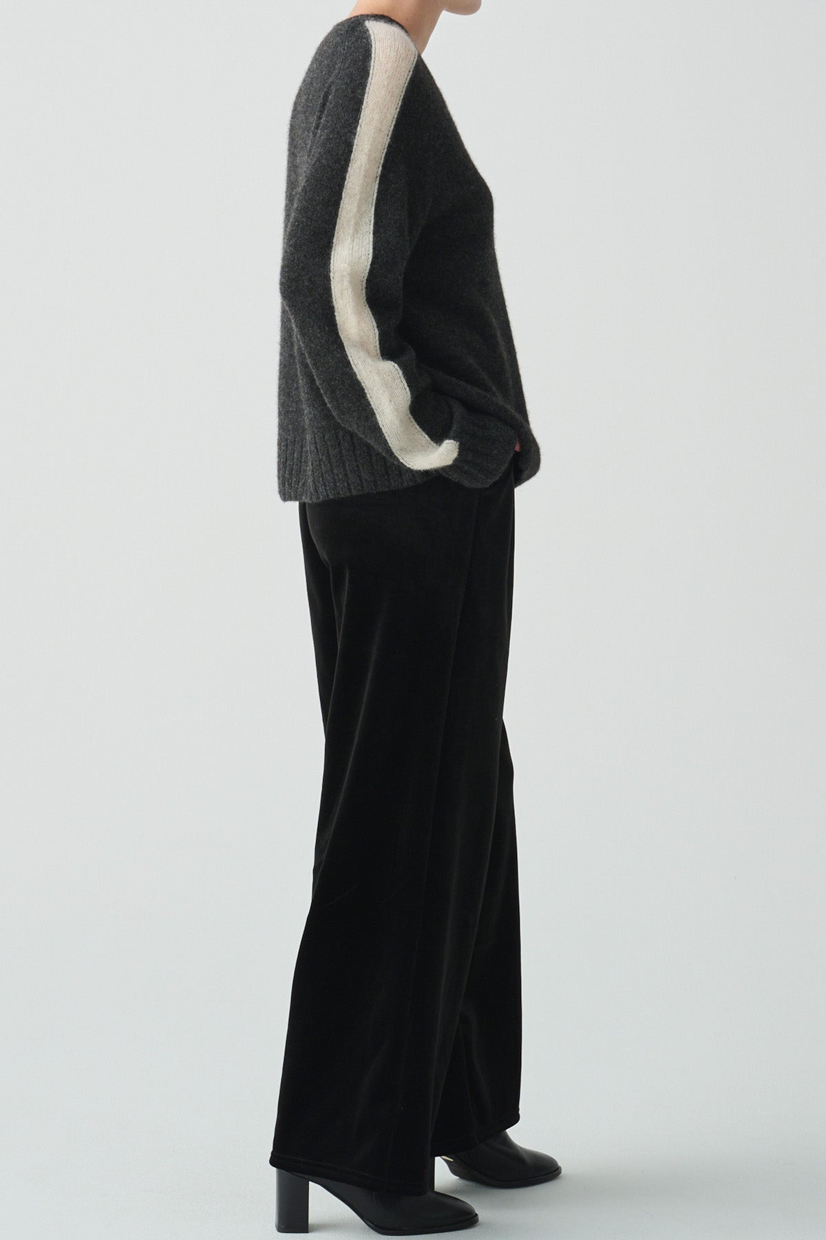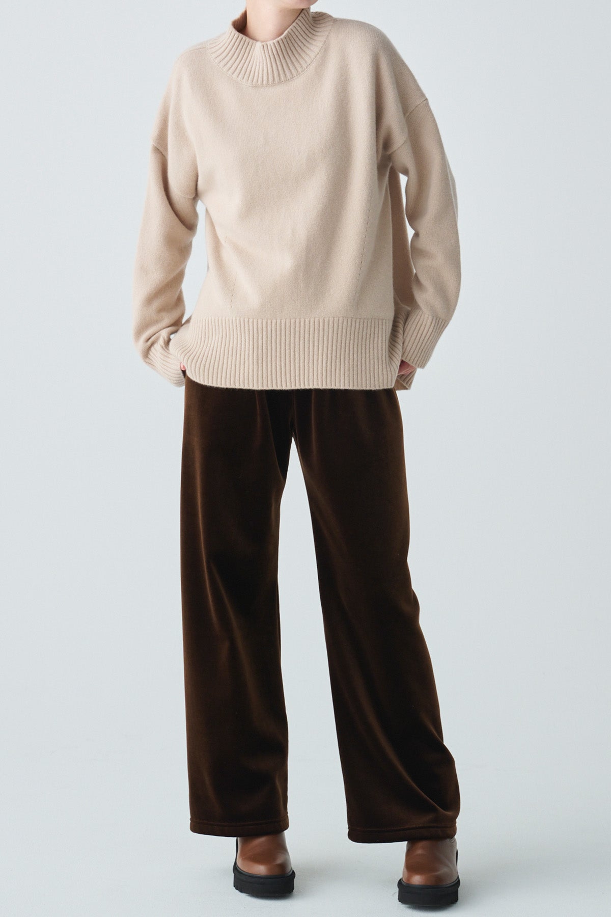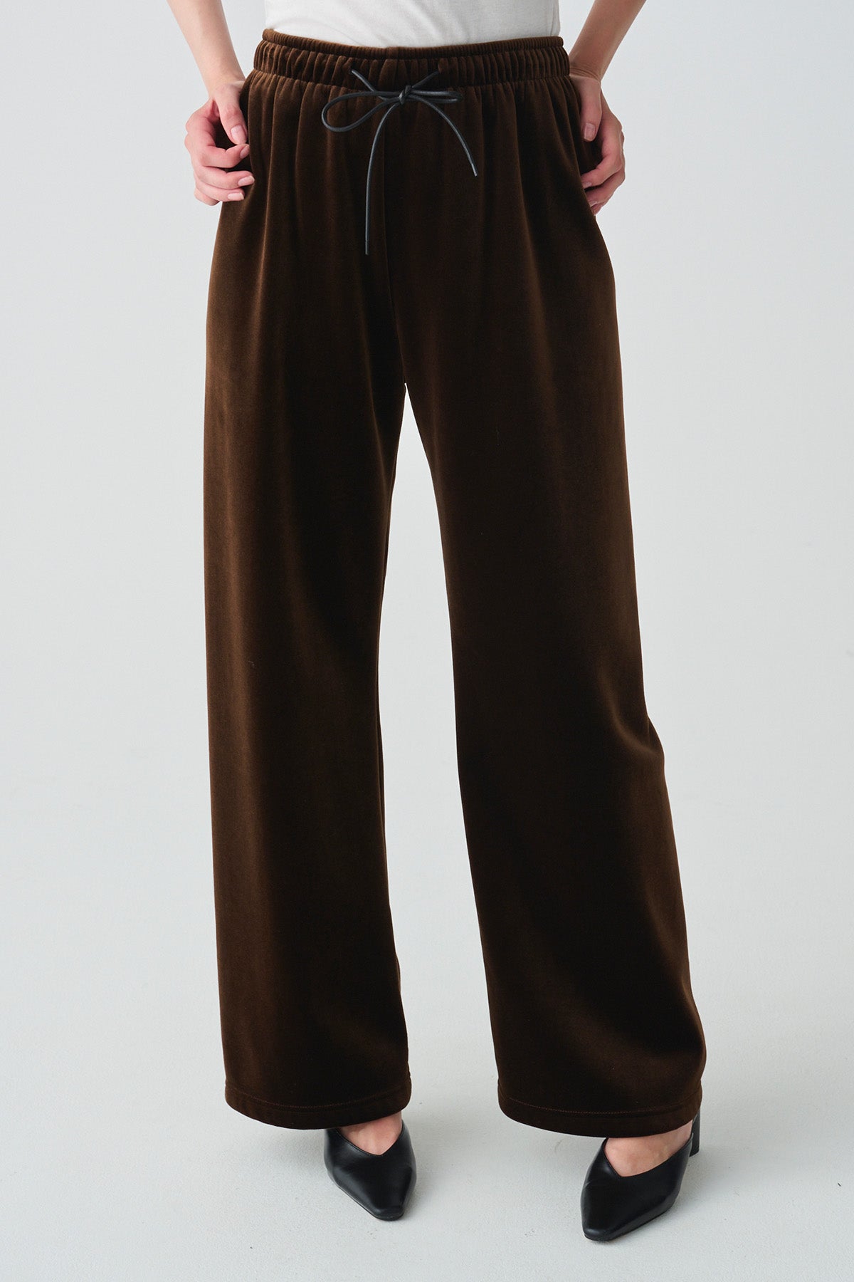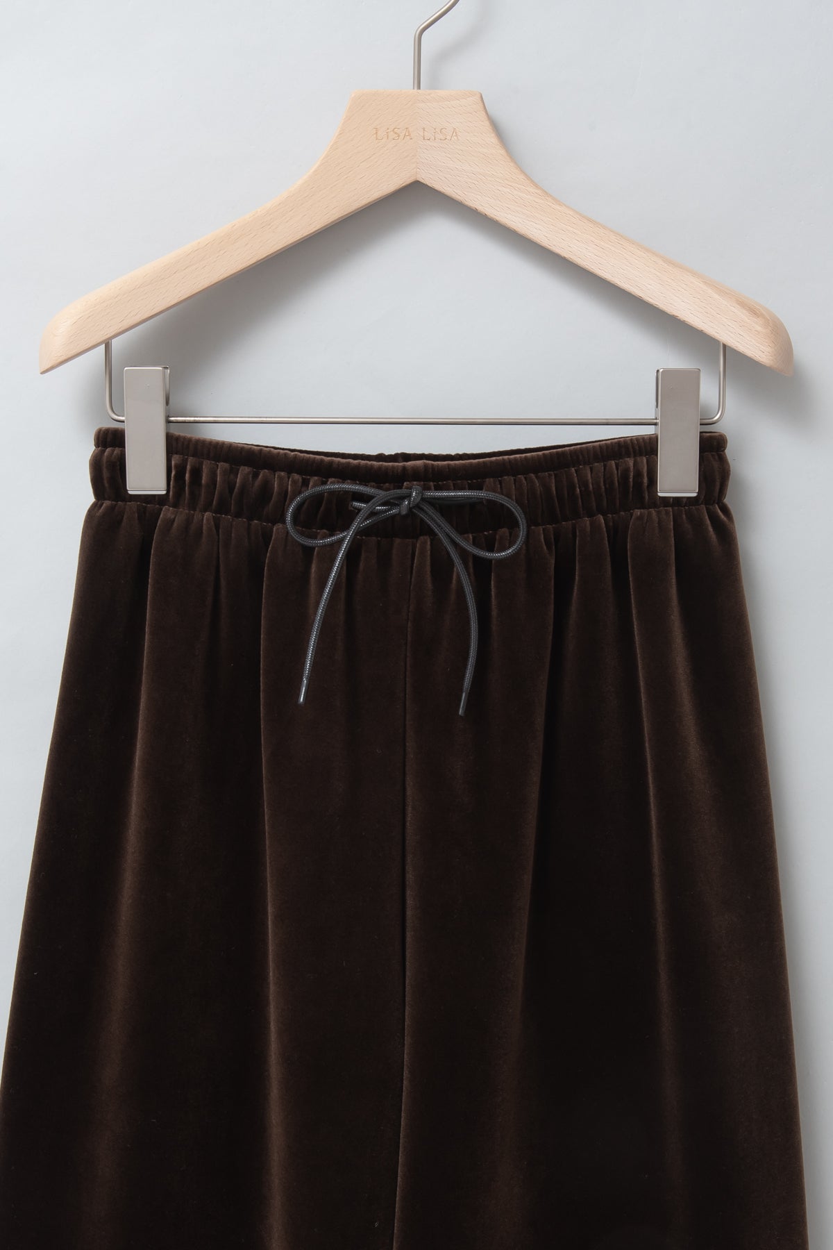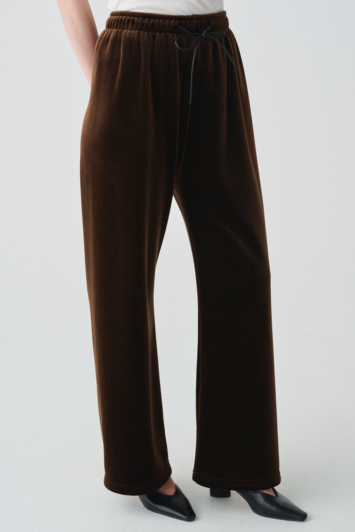 光沢のある上質なベロア素材で、すとんと落ちる美しいシルエットが魅力のベロアパンツ