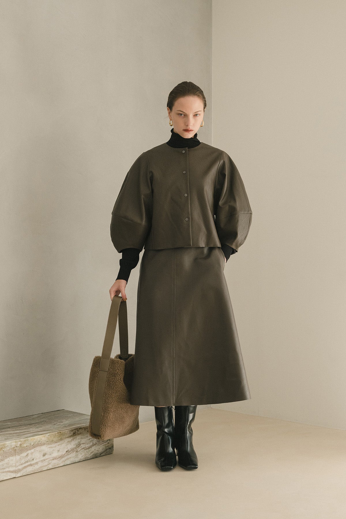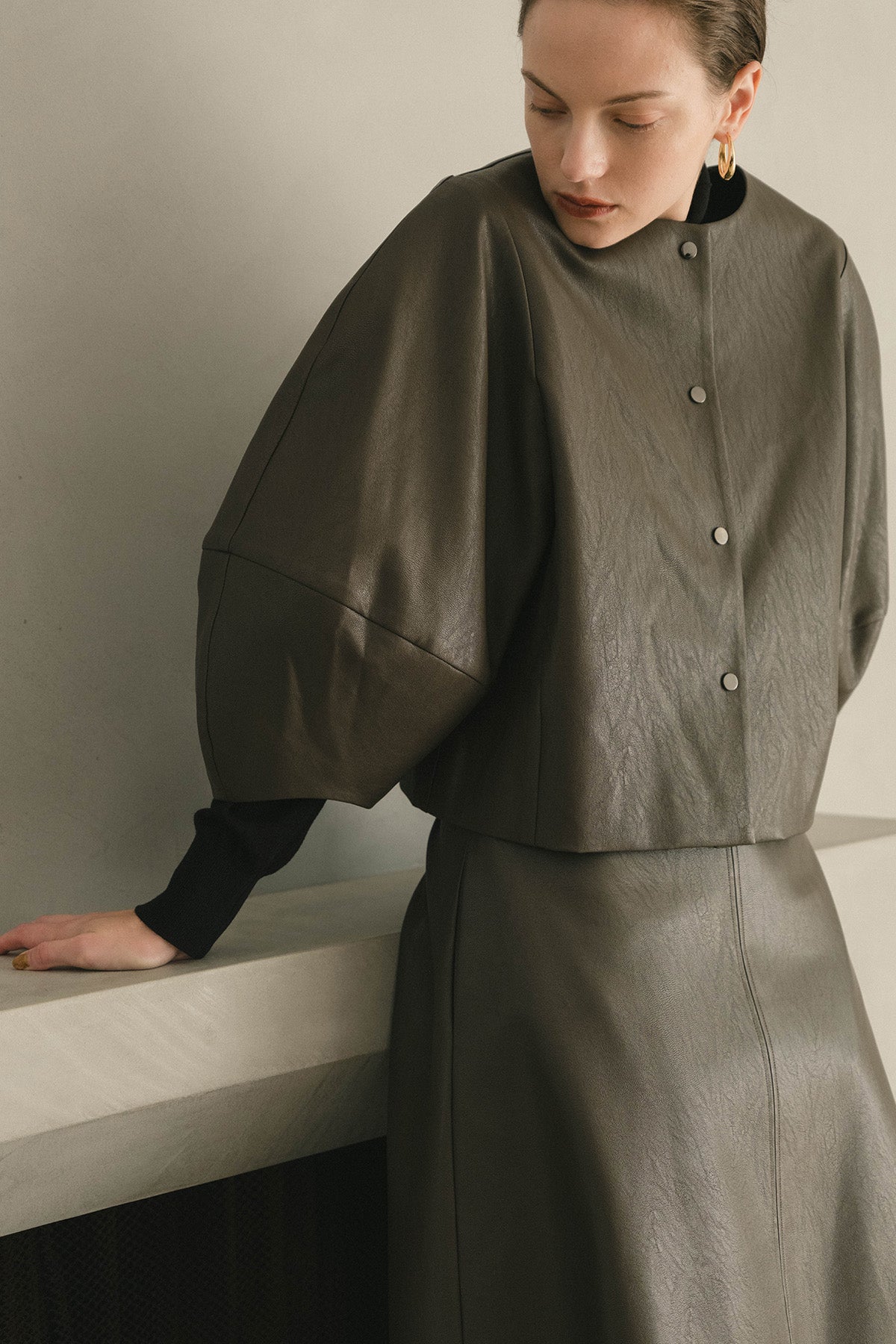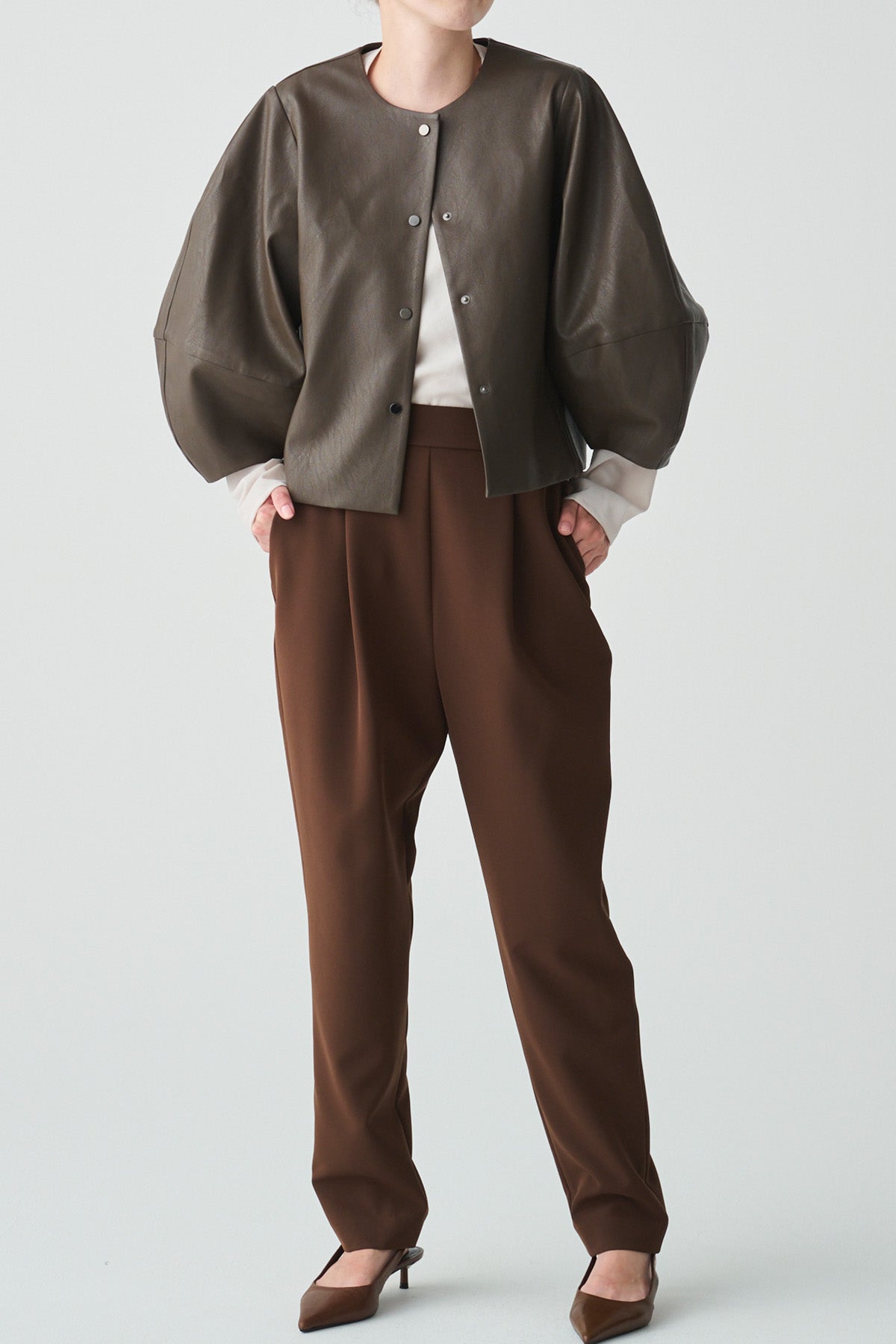 辛口なフェイクレザーを、ふんわりとしたボリュームスリーブで女性らしく仕上げたブルゾン