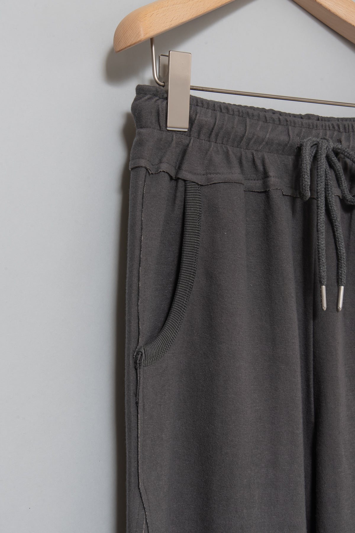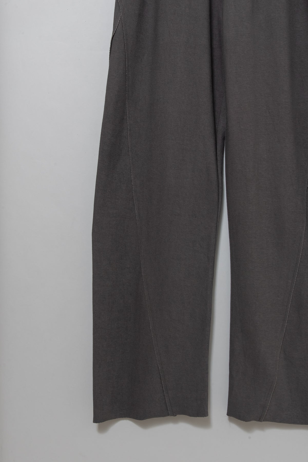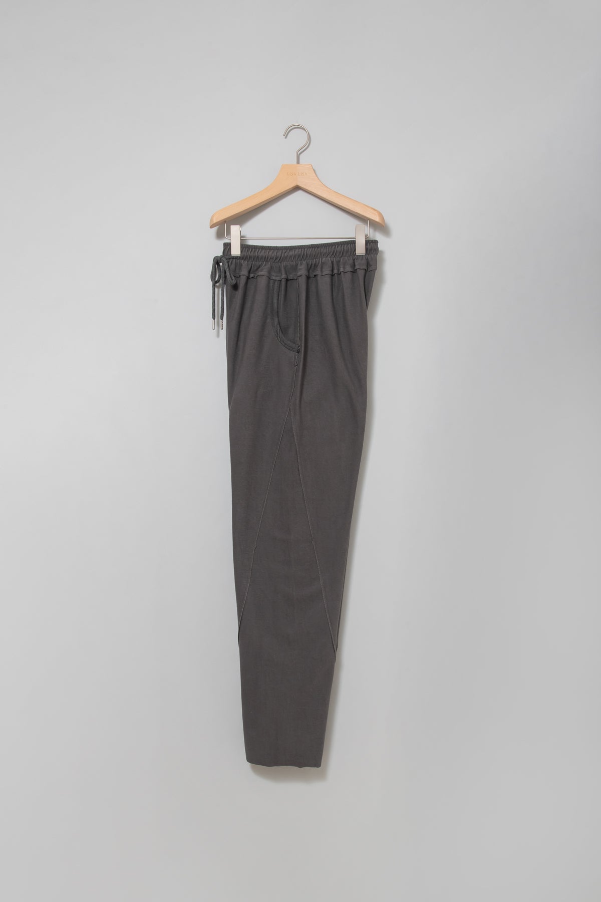 斜めに走るステッチと切りっぱなしのディテールが印象的なスウェットパンツ