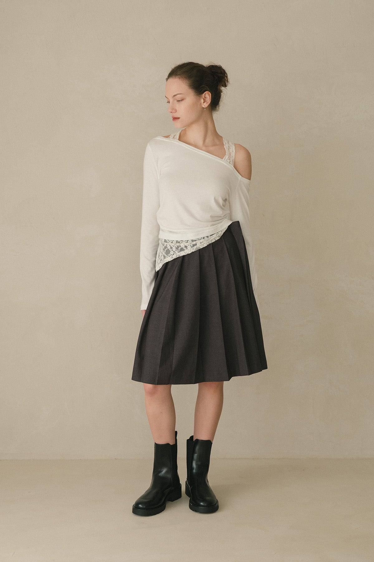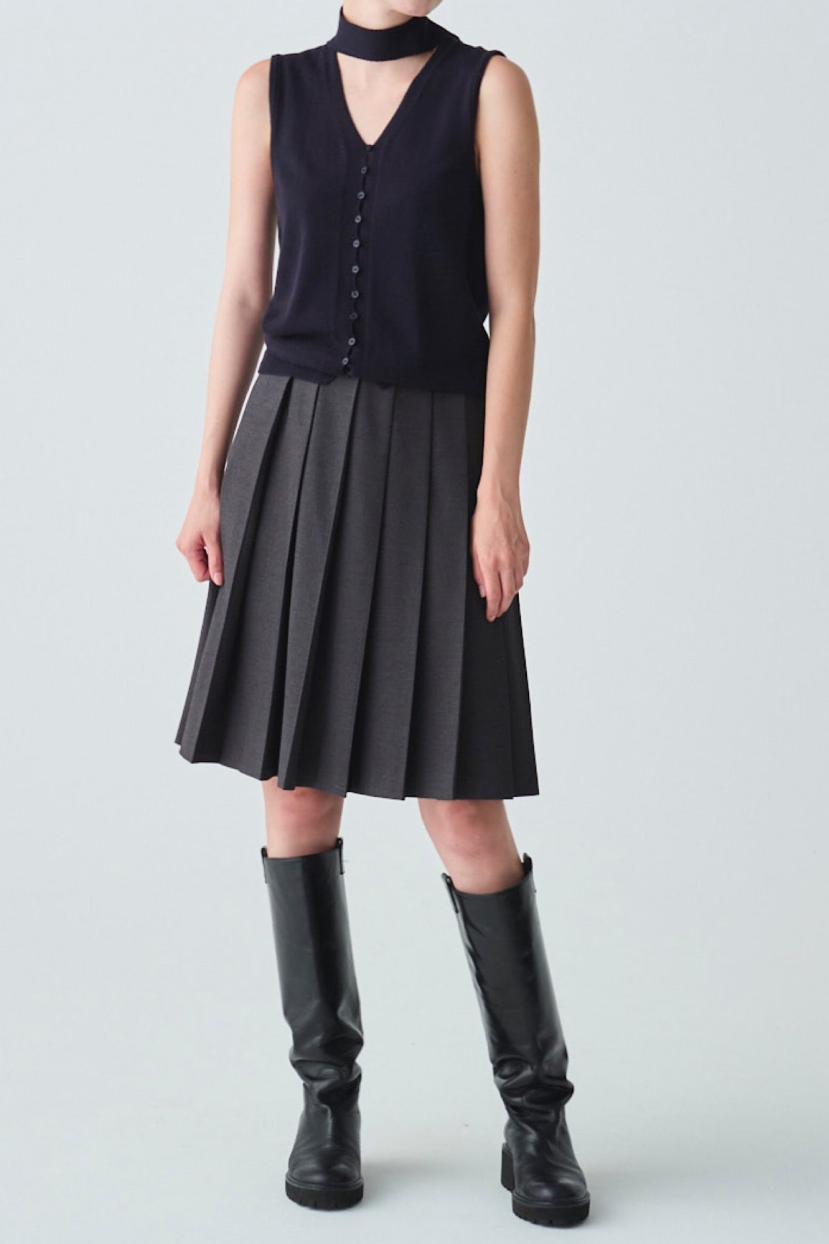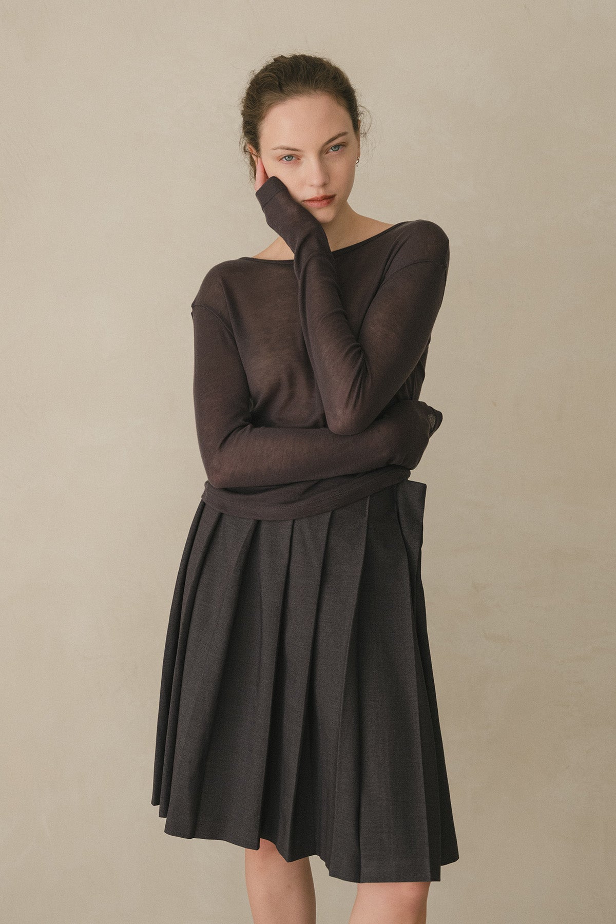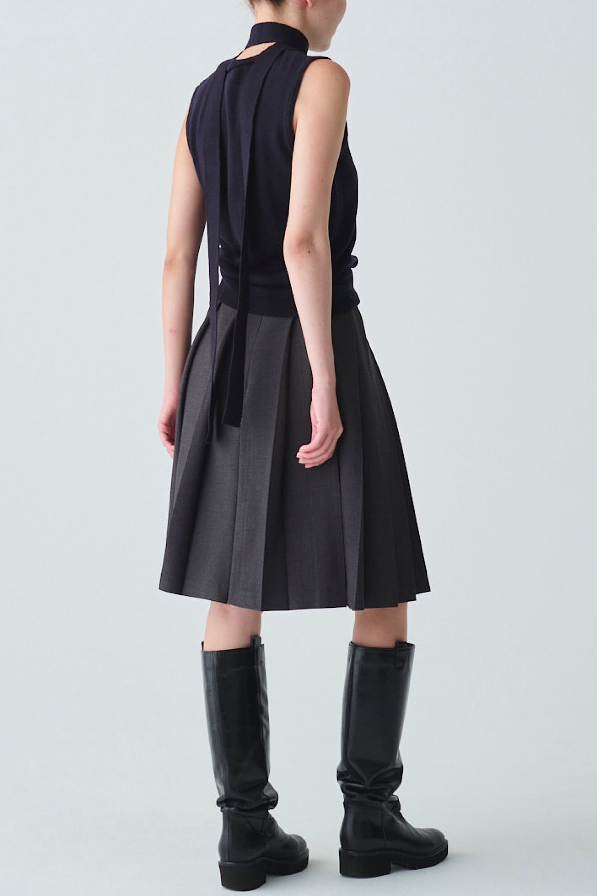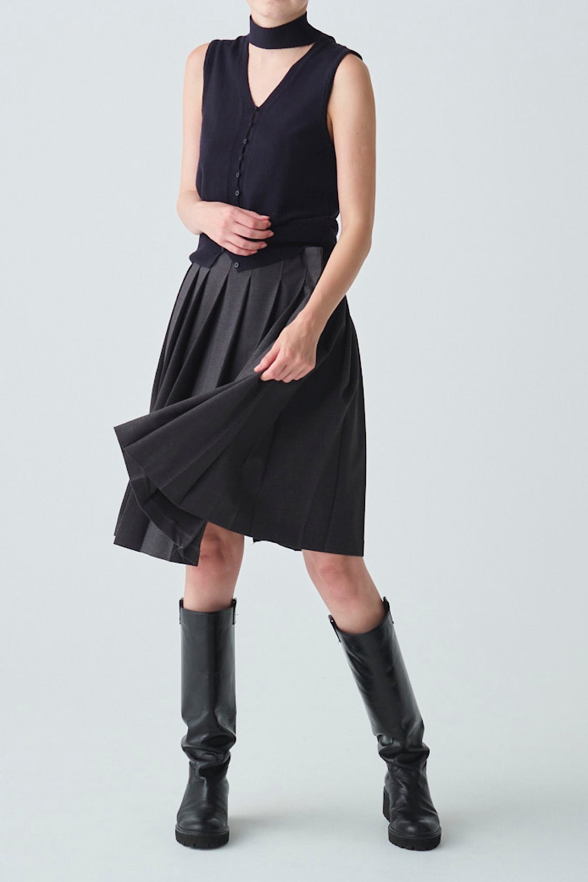 総プリーツ、ポケット無し、左前ウエストデザインアクセント有り