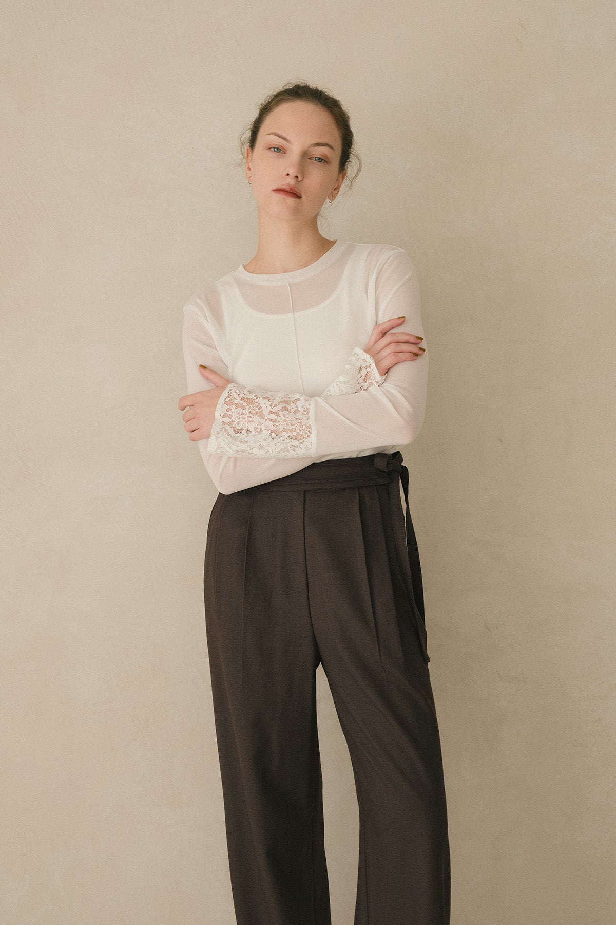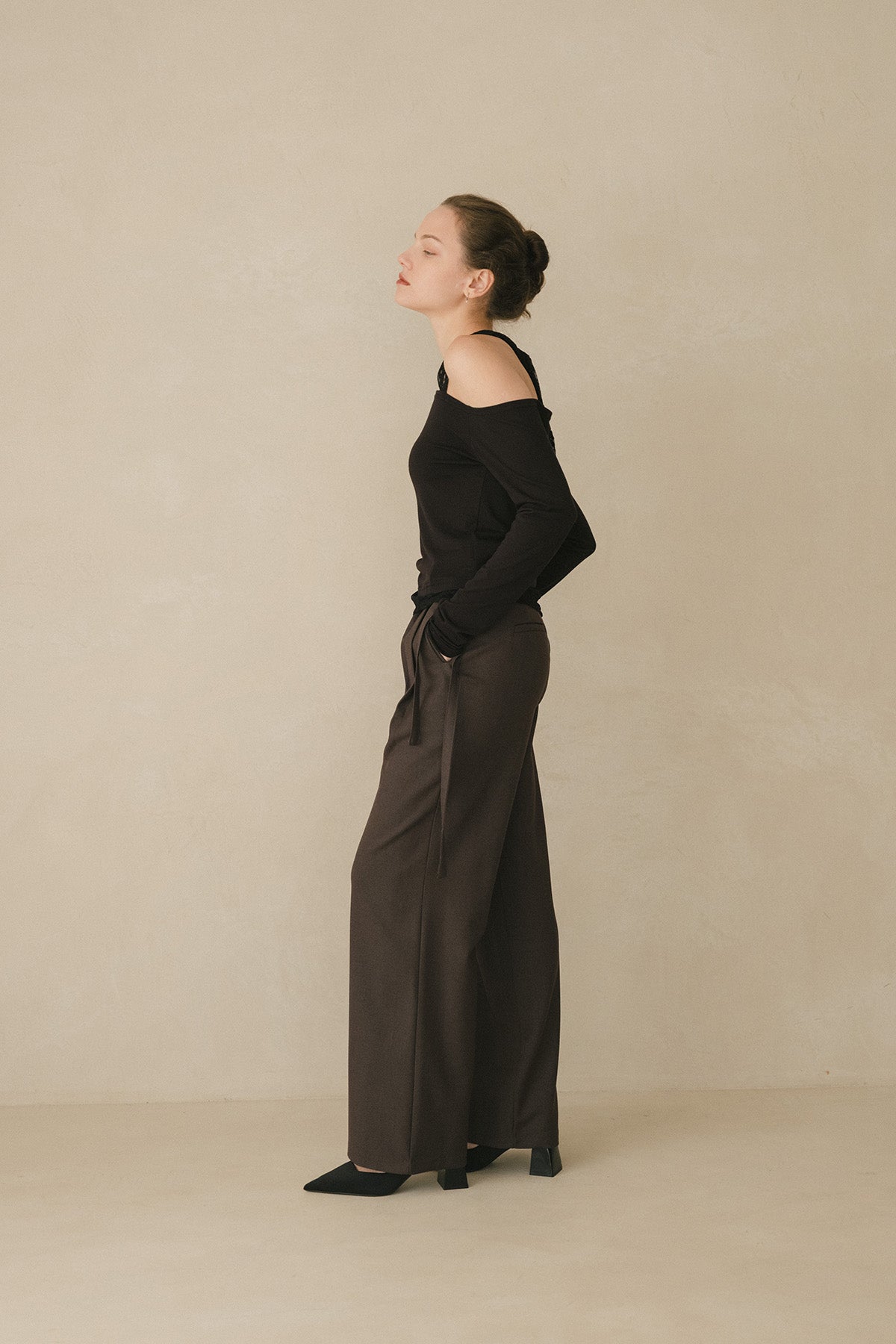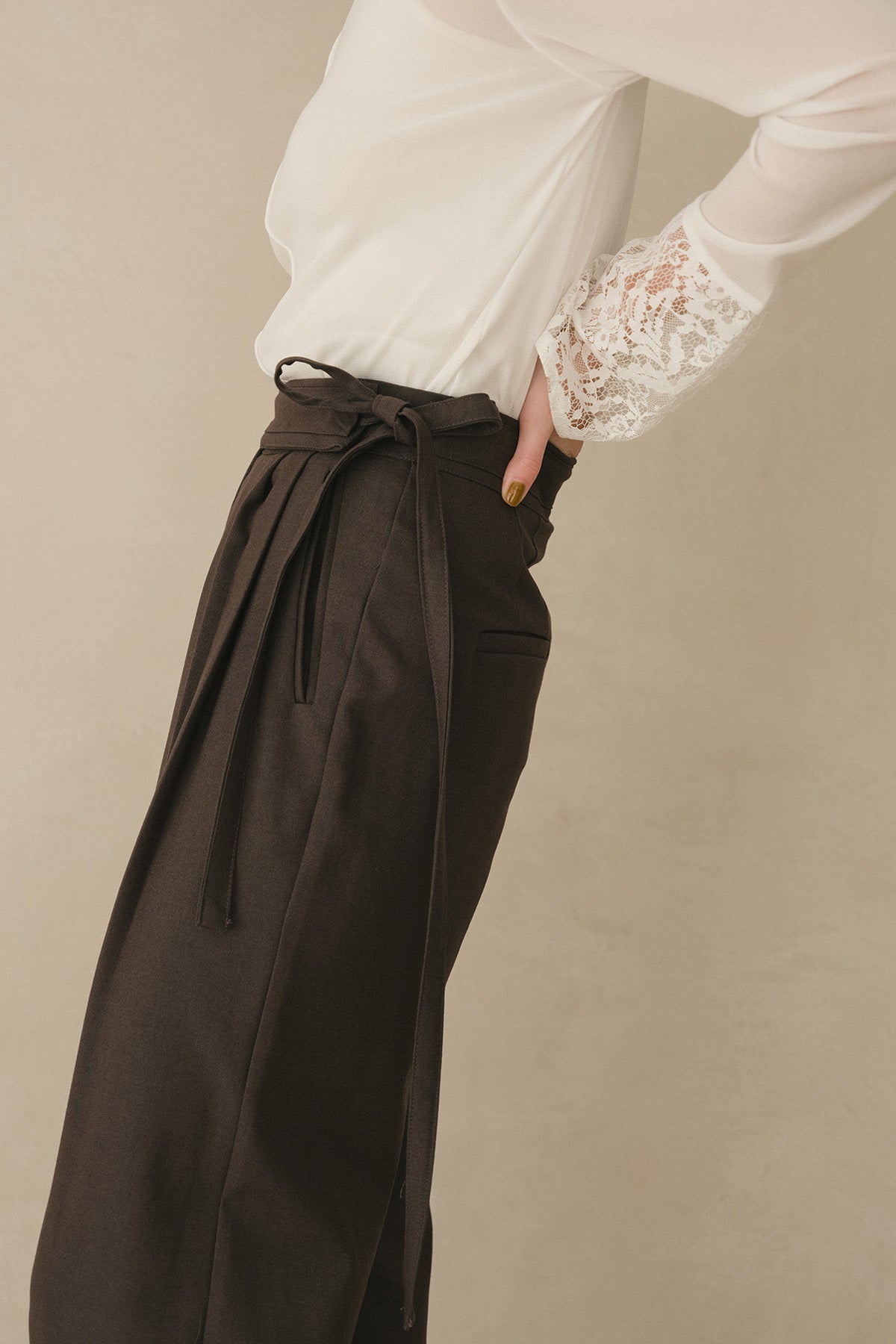 ウエストのサイドリボンがポイントになり、タックインスタイルも洗練された印象に