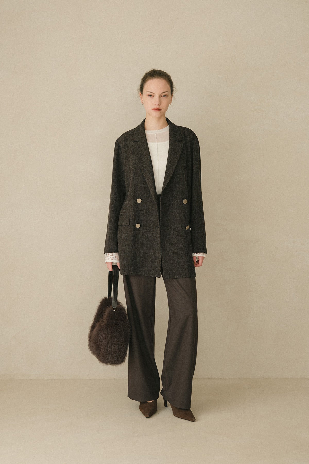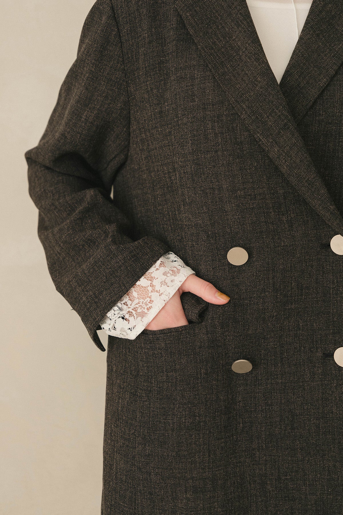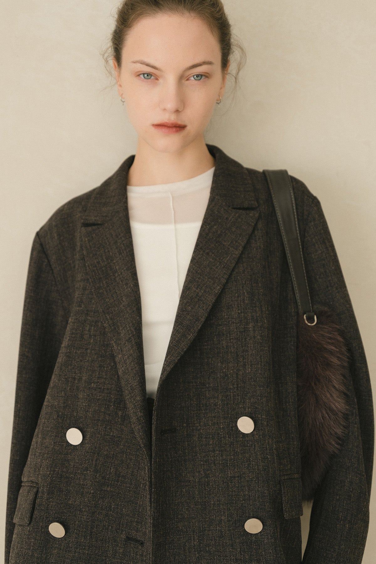 ピークドラペルが程よくモードな印象を与えるダブルジャケット