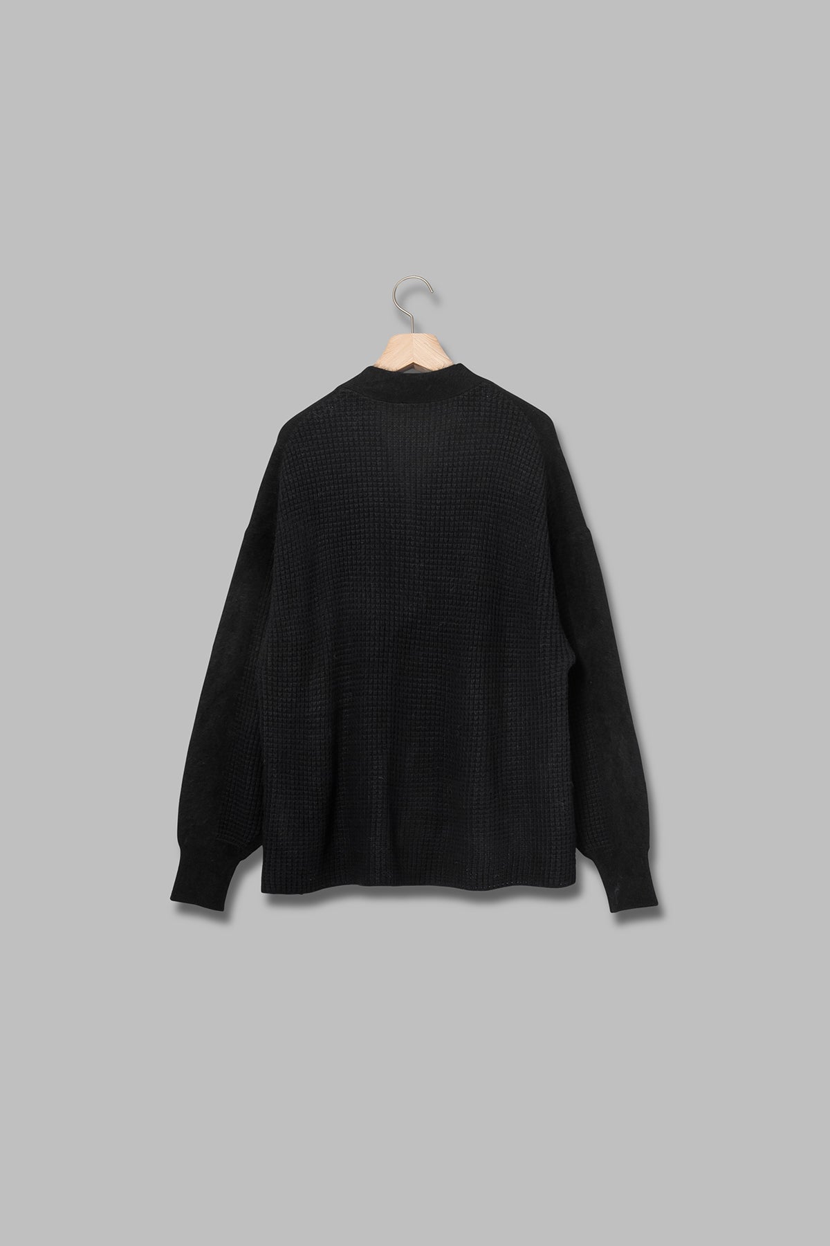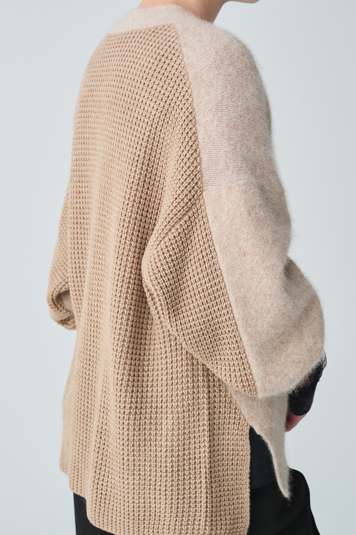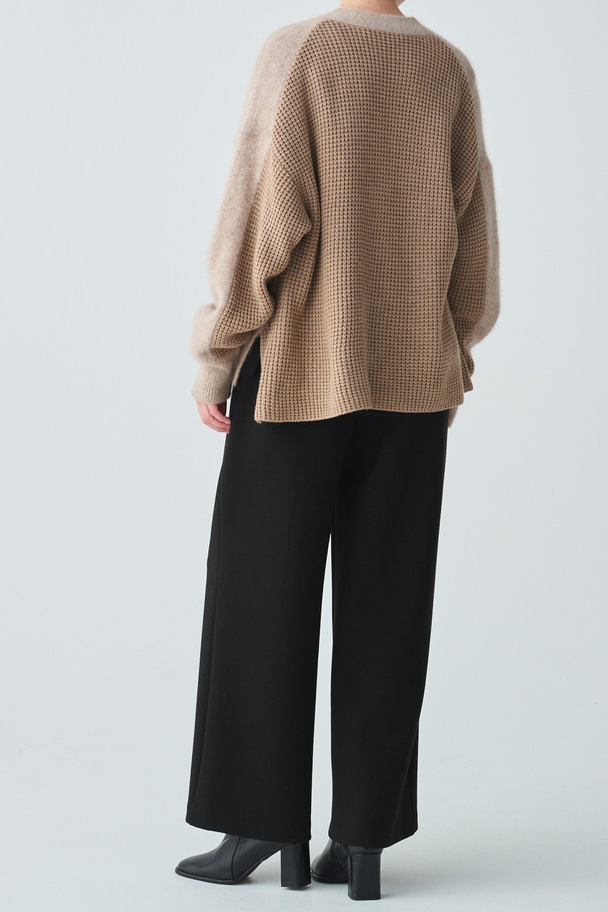 フロントはシンプルに、バックはワッフル編みで切り替え、後ろ姿に立体感を演出しました